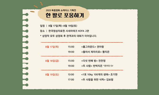 2023 독립영화 쇼케이스 기획위원회가 주관하고 (사)한국독립영화협회, 서울시, 서울영상위원회가 주최하며 독립영화전용관 인디스페이스와 한국영상자료원이 후원하는 2023 독립영화 쇼케이스 기획전은 “한 팔로 포옹하기”라는 제목으로 돌봄에 관한 여섯 편의 다큐멘터리를 소개합니다. 한 팔로 카메라를 든 채 상대방을 기록하는 다큐멘터리라는 행위는 돌봄과 닮아있습니다. 한국어 ‘돌보다’는 ‘돌다’와 ‘보다’가 합쳐진 말입니다. 누군가를 돌보기 위해서는 그 대상을 ‘돌아봐야’합니다. 다큐멘터리는 대상으로 시선을 돌려 바라보는 행위입니다. 그렇기에 누군가를 살피고 기다리고 기억하고 기록하는 다큐멘터리적 행위는 곧 돌봄에 동참하는 것이기도 합니다. <홈그라운드>는 한국 최초의 레즈비언 바 ‘레스보스’의 사장 윤김명우의 삶을 따라가며 퀴어 공동체 내에 존재하는 대안적 돌봄의 형태를 담아냅니다. <두 사람>은 파독 간호사로 젊은 시절을 보낸 노년의 레즈비언 부부가 서로를 돌보며 살아가는 모습을 기록합니다. <1포 10kg 100개의 생애>는 치매 환자인 아버지의 현재를 영화적으로 돌보고자 하는 시도입니다. <두 사람을 위한 식탁>은 엇나간 방식의 돌봄으로 인해 틀어진 모녀가 다시금 대면하는 이야기를 담습니다. <다섯 번째 방>은 수년간 가족 내에서 돌봄노동을 수행했던 어머니가 마침내 자기-돌봄을 실천하는 과정을 기록합니다. <돌아서 제자리로>는 학교라는 제도 바깥에서 청소년 돌봄을 실천하고자 하는 이들의 고군분투를 보여줍니다. 여섯 편의 영화는 가족, 제도, 자본이 수용하지 못한 이들을 한 팔로 포옹하려 시도합니다. 기획전을 준비하며 카메라에 담긴 이들뿐 아니라 카메라를 들고 있던 각 영화의 감독 또한 영화의 처음과 마지막에서 변화했음을 느꼈습니다. 각 영화가 담아낸 상황은 다르지만, 각자 그 속에서 발견한 “부러졌다가 붙은 다리뼈”를 기록합니다. 그 발견의 순간을 함께할 분들을 극장에서 기다리고 있겠습니다.