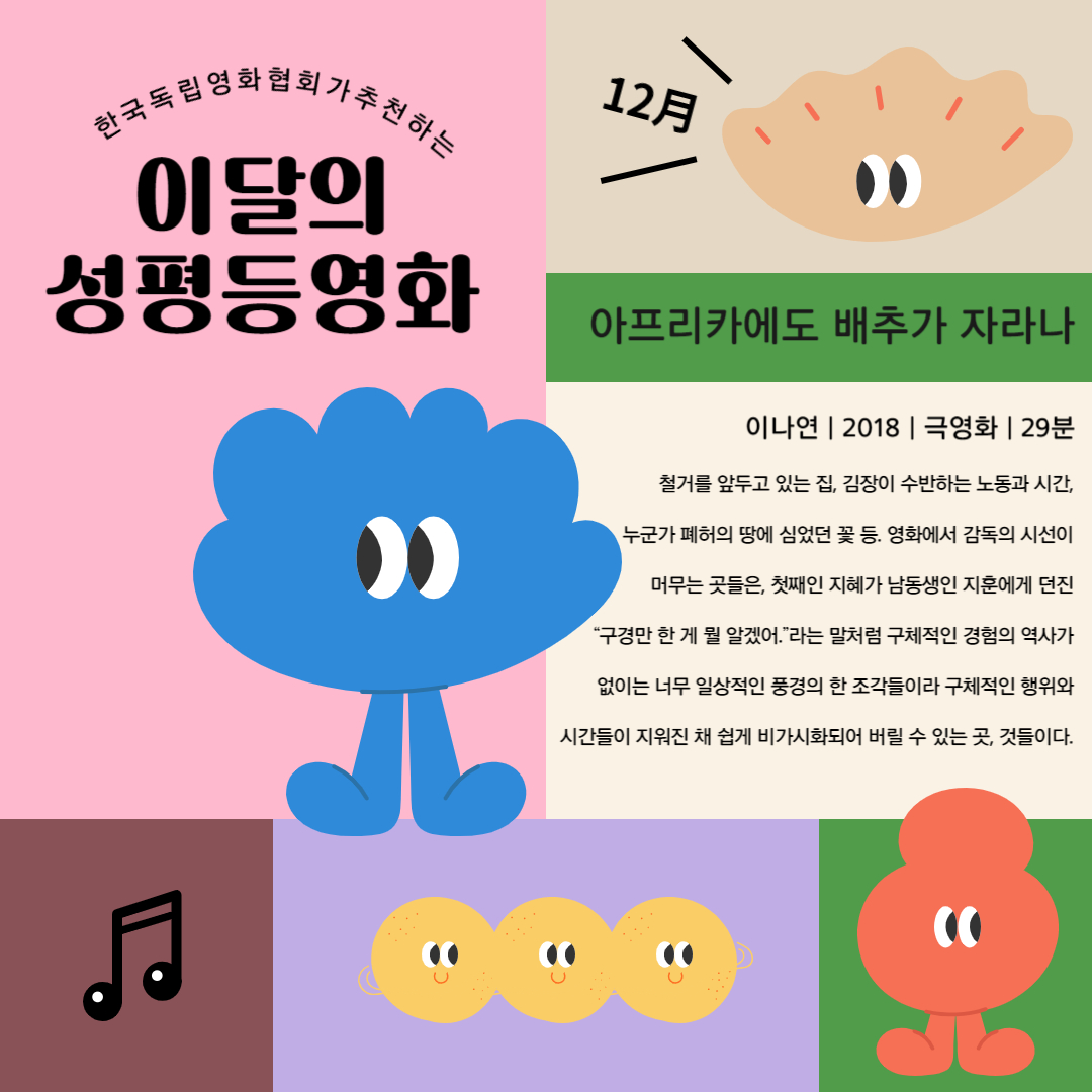 이 영화를 떠올리고 있자니 또 생각나는 어떤 풍경이 있다. 혼자 사시는 80대 이상의 분들을 인터뷰하며 촬영 다닌 적이 있다. 어느 80대 중반의 여성분의 집에 방문했을 때, 혼자 먹을 김장을 담그고 계셔서 김장을 담그시며 인터뷰를 진행했었다. 자녀분들에게 보내주시려고 김장을 하시는 거냐 여쭈니 자신이 먹을 거라고 하셨다. 오롯이 자신을 위해 김장을 담그는 모습이 너무 인상적으로 다가왔는데 <아프리카에도 배추가 자라나>를 보고 있으면 떠오르는 사람들이 누구인지도 생각해 볼만하다.