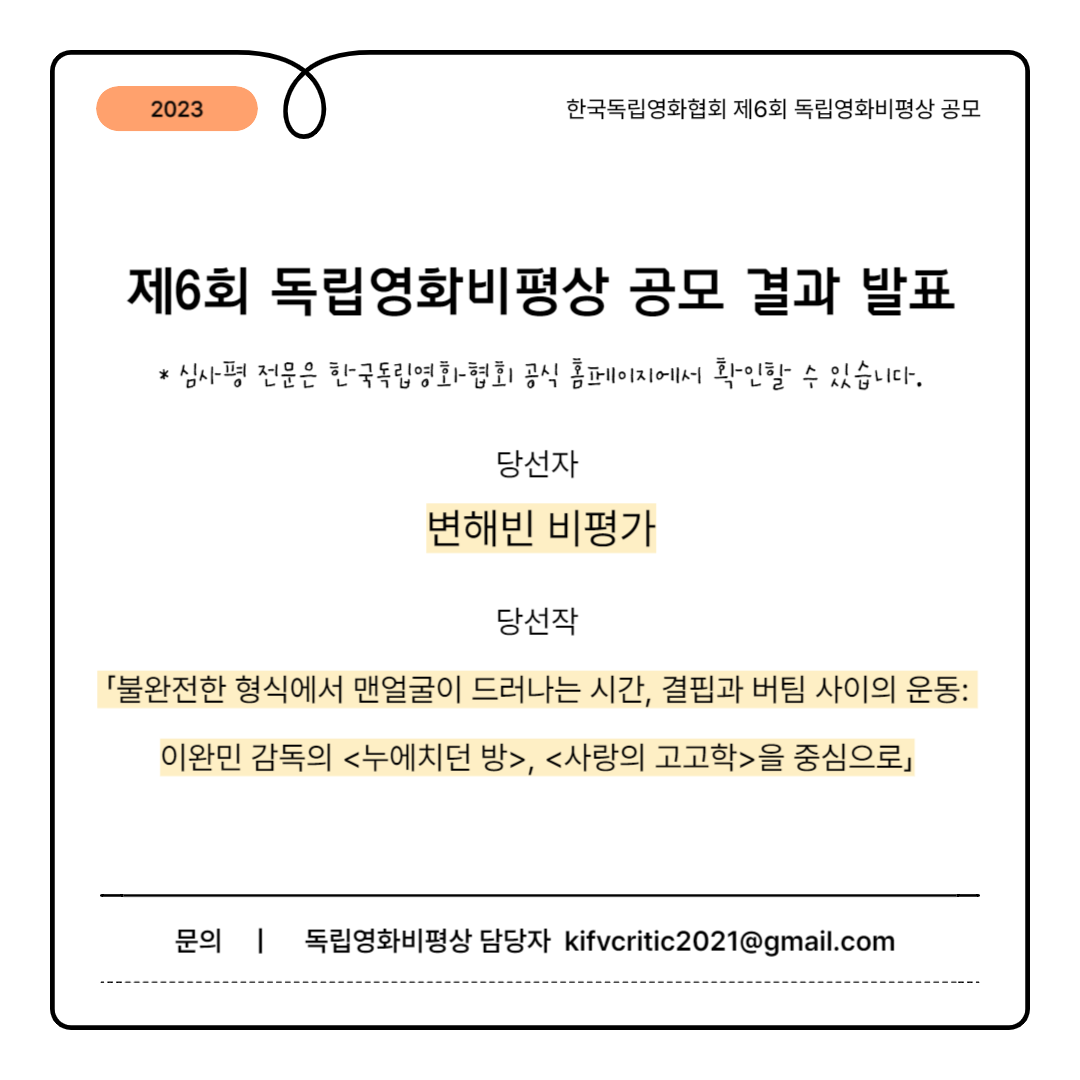 긴 논의 끝에 변해빈의 「불완전한 형식에서 맨얼굴이 드러나는 시간, 결핍과 버팀 사이의 운동: 이완민 감독의 <누에치던 방>, <사랑의 고고학>을 중심으로」를 당선작으로 선정했습니다. 필자의 직관과 분석의 언어로 인물의 상태와 영화의 작동을 논하며 결론에 이르는 모험적인 태도가 안정된 구조의 글 안에서 펼쳐지고 있다는 점이 큰 요인이 되었습니다.