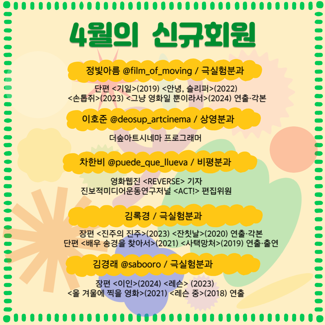 환영을 가득 담아 4월의 신규회원을 소개합니다. 한국독립영화협회는 독립영화 활성화와 저변 확대를 위해 정책 연구 및 토론, 큐레이션 상영, 회원 활동 등 다양한 사업을 진행합니다. 언제든 새로운 분들과의 만남을 기다리고 있으니 회원 가입 신청을 원하시는 분들은 상단 링크를 참고해주세요🙌🏼🙂🙌🏼