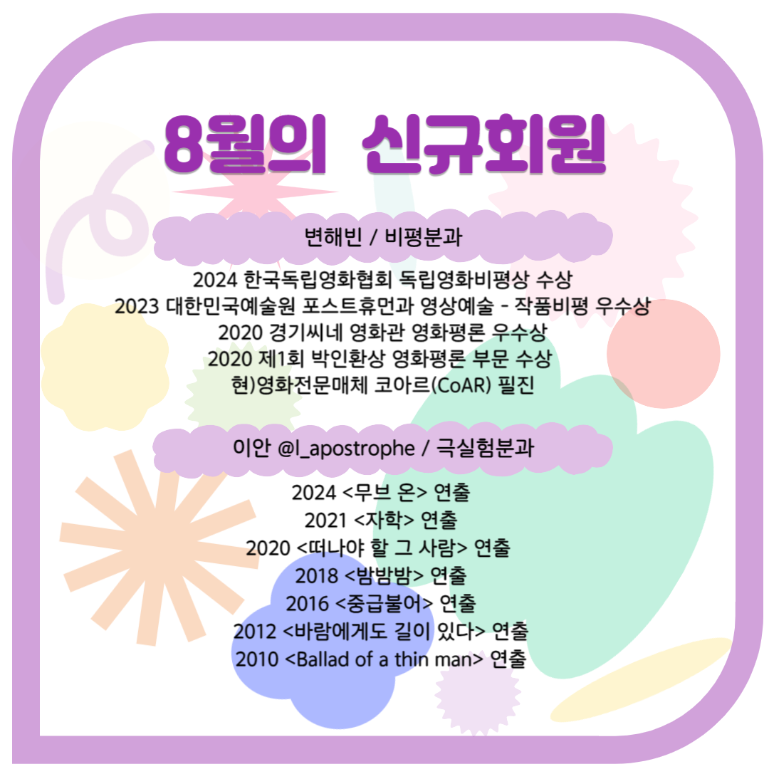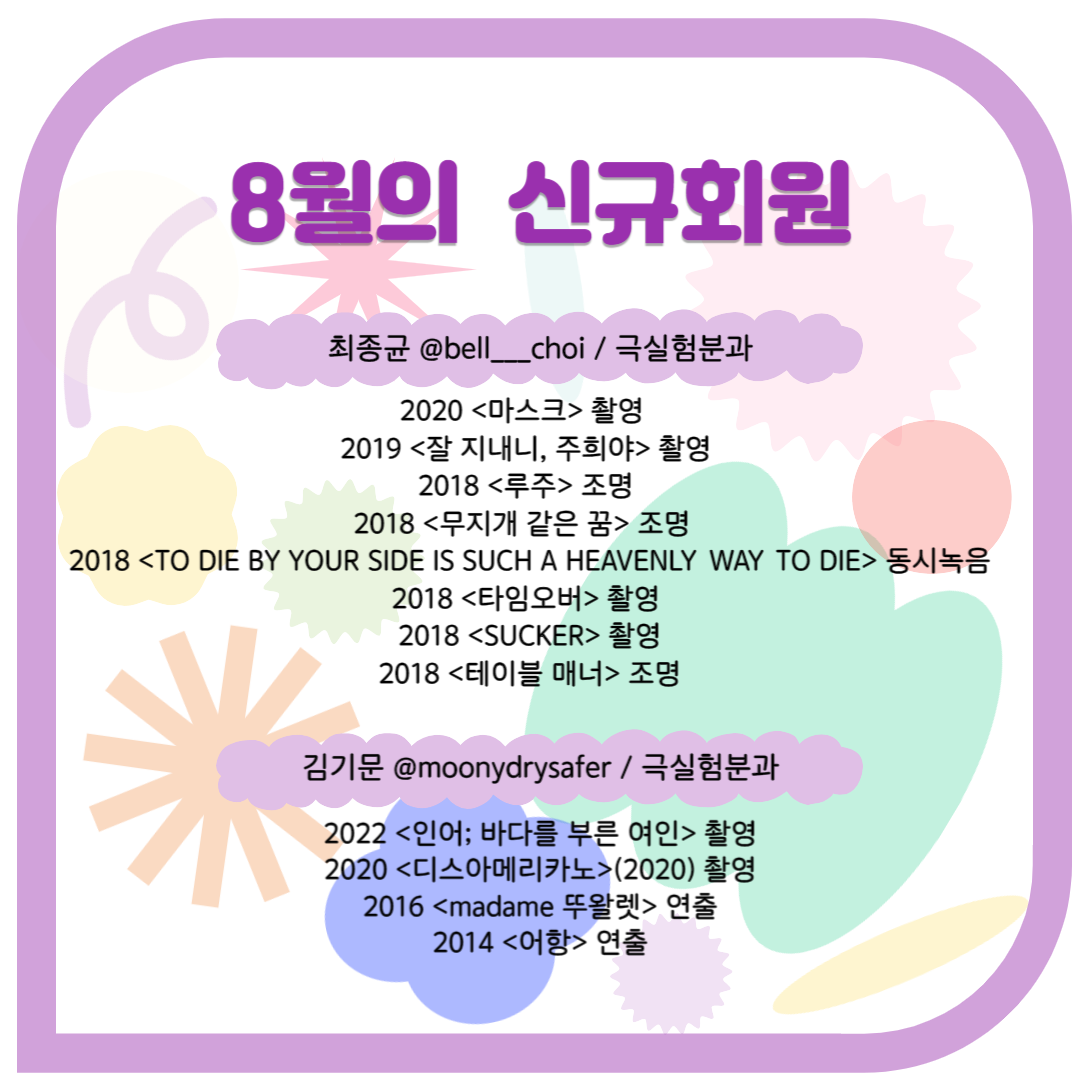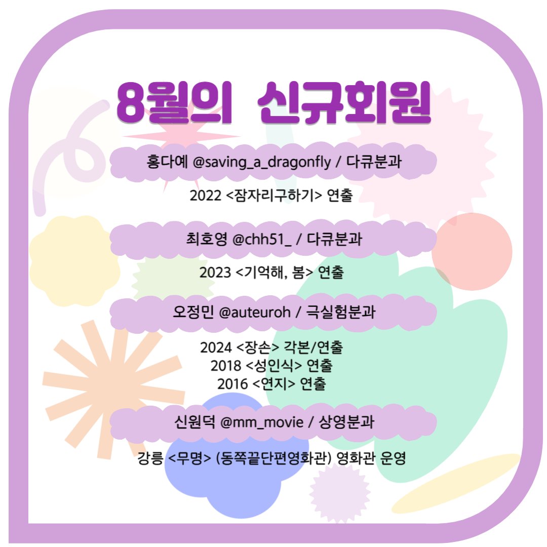 환영을 가득 담아 8월의 신규회원을 소개합니다. 한국독립영화협회는 독립영화 활성화와 저변 확대를 위해 정책 연구 및 토론, 큐레이션 상영, 회원 활동 등 다양한 사업을 진행합니다. 새로운 분들과의 만남을 기다리고 있으니 정회원 가입을 원하시는 분들은 아래 링크를 참고해주세요!