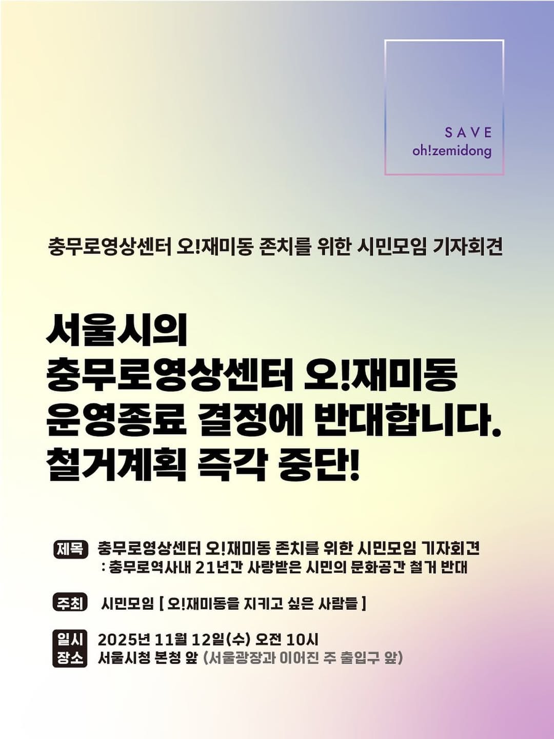 1900여 명 시민의 연서명에는 "오!재미동은 시민의 공간"이라는 목 소리가 담겨 있다. 이는 서울시가 일방적으로 결정할 수 있는 사안이 아니라 시민이 함께 결정해야 할 문제이다. 오!재미동은 지하철 역사 내에 존재하는 단순한 공간이 아니라, 21년간 축적된 시민들의 기억과 문화적 실천이 응축된 장소로써 공공 자산이다. 서울영화센터의 개관은 오!재미동의 소멸을 정당화 할 근거가 될 수 없다.
