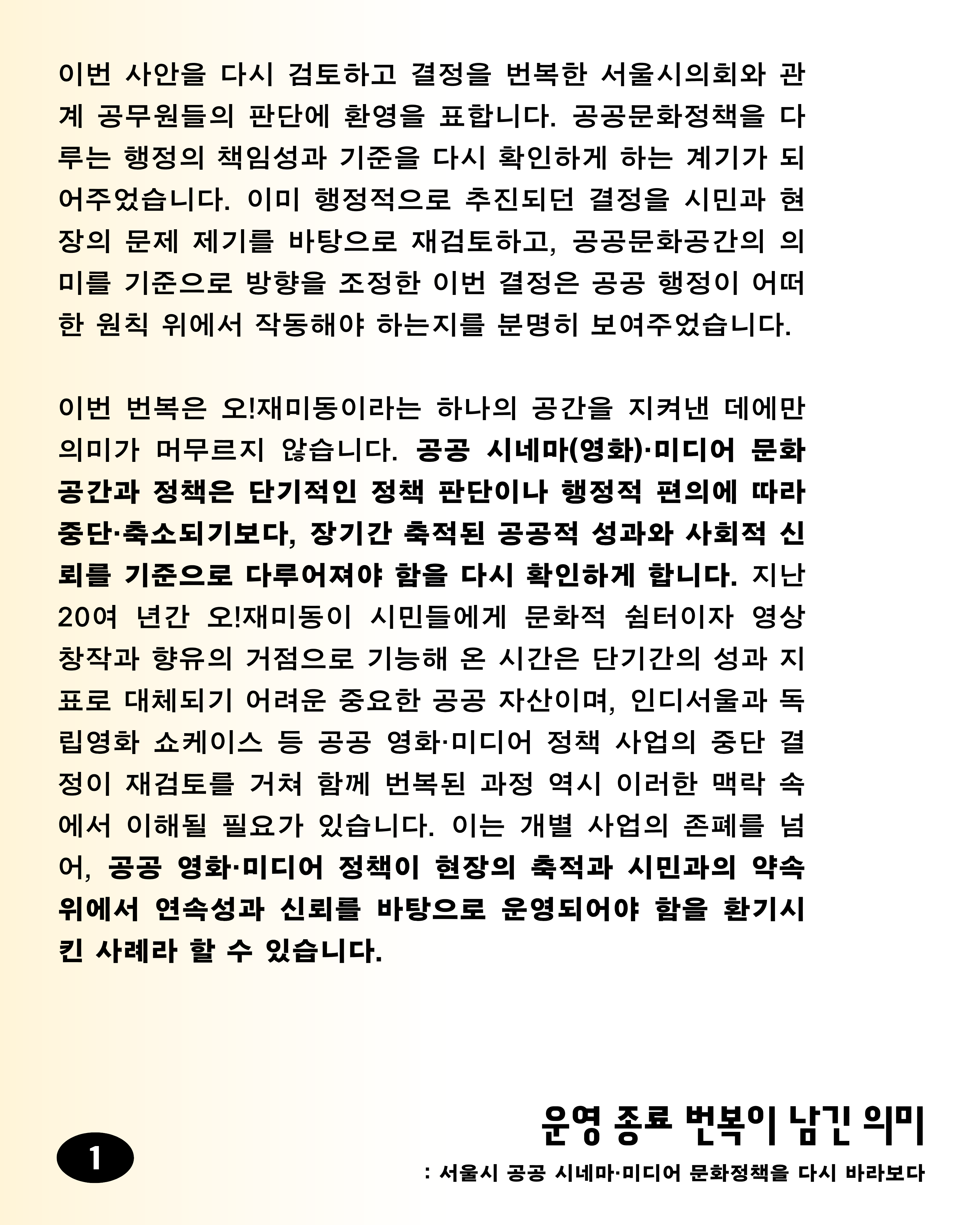 이번 번복은 오!재미동이라는 하나의 공간을 지켜낸 데에만 의미가 머무르지 않습니다. 공공 영화·미디어 문화공간과 정책은 단기적인 정책 판단이나 행정적 편의에 따라 중단·축소되기보다, 장기간 축적된 공공적 성과와 사회적 신뢰를 기준으로 다루어져야 함을 다시 확인하게 합니다. 지난 20여 년간 오!재미동이 시민들에게 문화적 쉼터이자 영상 창작과 향유의 거점으로 기능해 온 시간은 단기간의 성과 지표로 대체되기 어려운 중요한 공공 자산이며, 인디서울과 독립영화 쇼케이스 등 공공 영화·미디어 정책 사업의 중단 결정이 재검토를 거쳐 함께 번복된 과정 역시 이러한 맥락 속에서 이해될 필요가 있습니다. 이는 개별 사업의 존폐를 넘어, 공공 영화·미디어 정책이 현장의 축적과 시민과의 약속 위에서 연속성과 신뢰를 바탕으로 운영되어야 함을 환기시킨 사례라 할 수 있습니다.