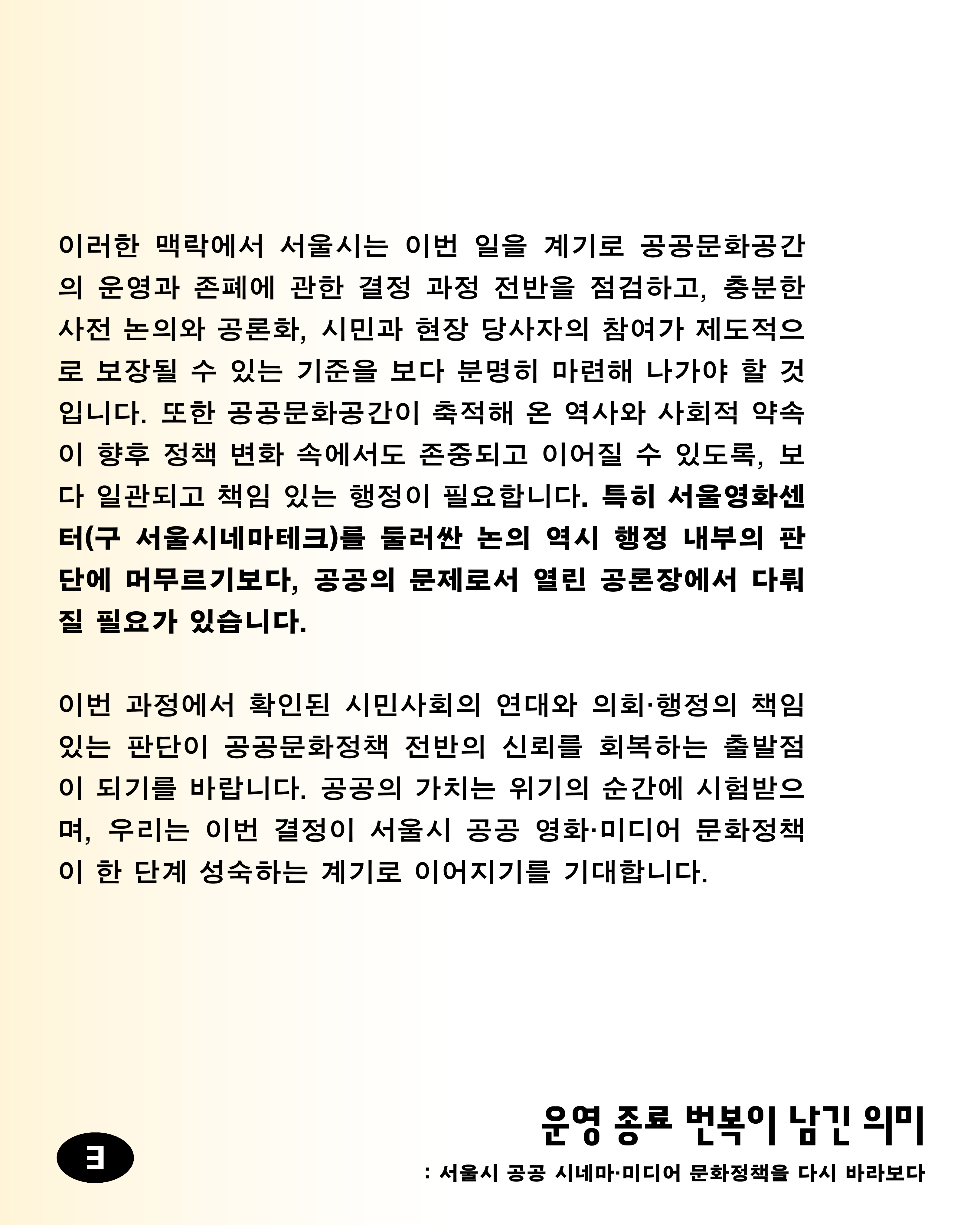 이러한 맥락에서 서울시는 이번 일을 계기로 공공문화공간의 운영과 존폐에 관한 결정 과정 전반을 점검하고, 충분한 사전 논의와 공론화, 시민과 현장 당사자의 참여가 제도적으로 보장될 수 있는 기준을 보다 분명히 마련해 나가야 할 것입니다. 또한 공공문화공간이 축적해 온 역사와 사회적 약속이 향후 정책 변화 속에서도 존중되고 이어질 수 있도록, 보다 일관되고 책임 있는 행정이 필요합니다. 특히 서울영화센터(구 서울시네마테크)를 둘러싼 논의 역시 행정 내부의 판단에 머무르기보다, 공공의 문제로서 열린 공론장에서 다뤄질 필요가 있습니다.