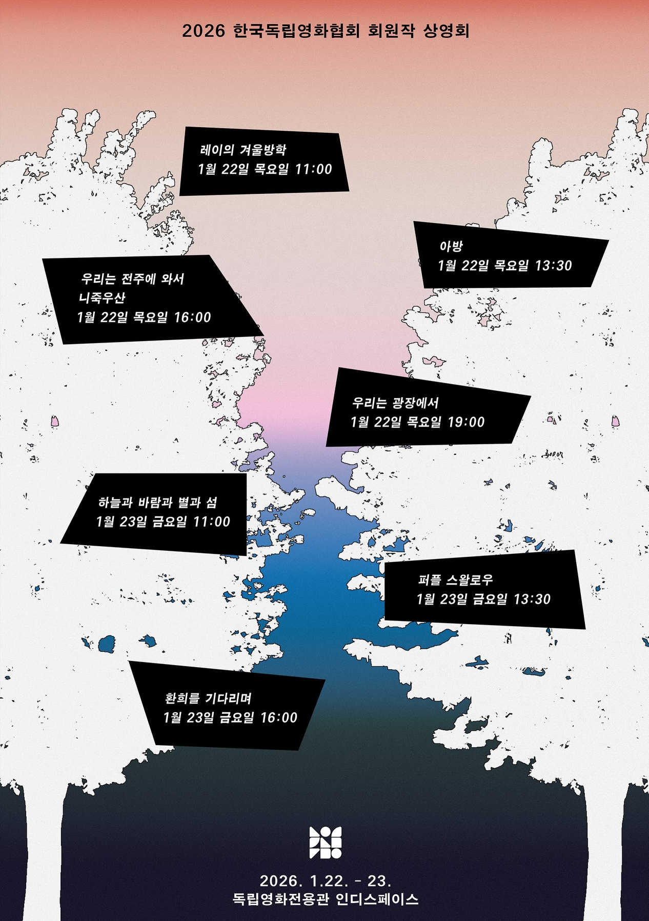 PPP X KIFV 〈독립영화, 가능성을 점거하다〉가 1월 17-18일, 24-25일, 2주에 걸쳐 성수동 Platz2 Seongsu에서 진행되었습니다. 추운 날씨에도 시간을 내어 현장을 찾아주신 관객 여러분께, 또 거리에서 우연히 마주친 독립영화의 풍경을 지나치지 않고 안으로 들어와 기꺼이 함께해주신 분들께도 감사의 마음을 전합니다. <누구나 열 수 있는 상영관> 각 회차 상영을 직접 기획하여, 성심껏 운영해주신 감독님들께도 진심으로 감사드립니다. |