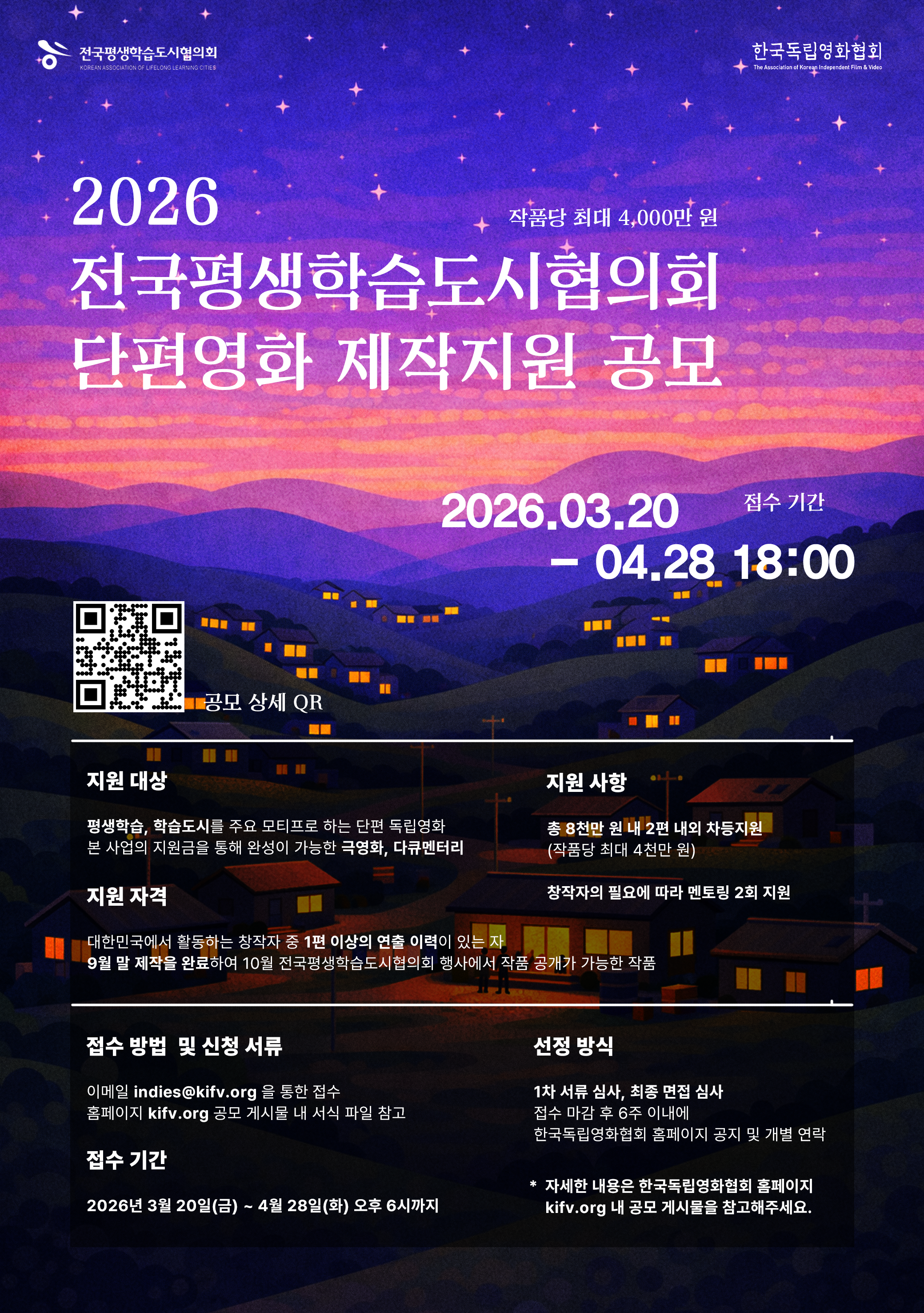 - 제작 완료 시 크레딧에 [2026 전국평생학습도시협의회 제작지원작], [한국독립영화협회] 지원 명시