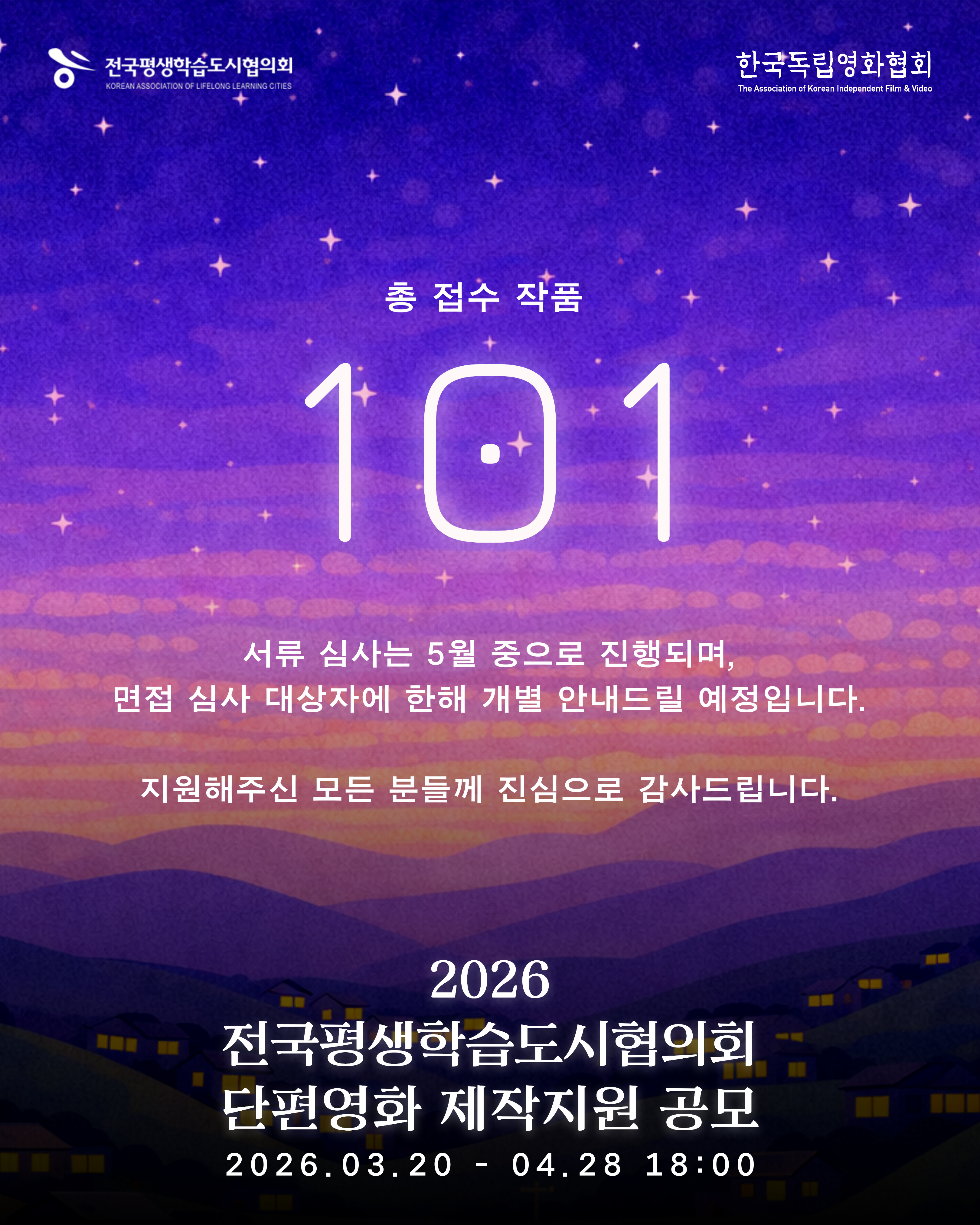 2026 전국평생학습도시협의회 단편영화 제작지원 공모 접수가 4월 28일(화)자로 마감되었습니다.